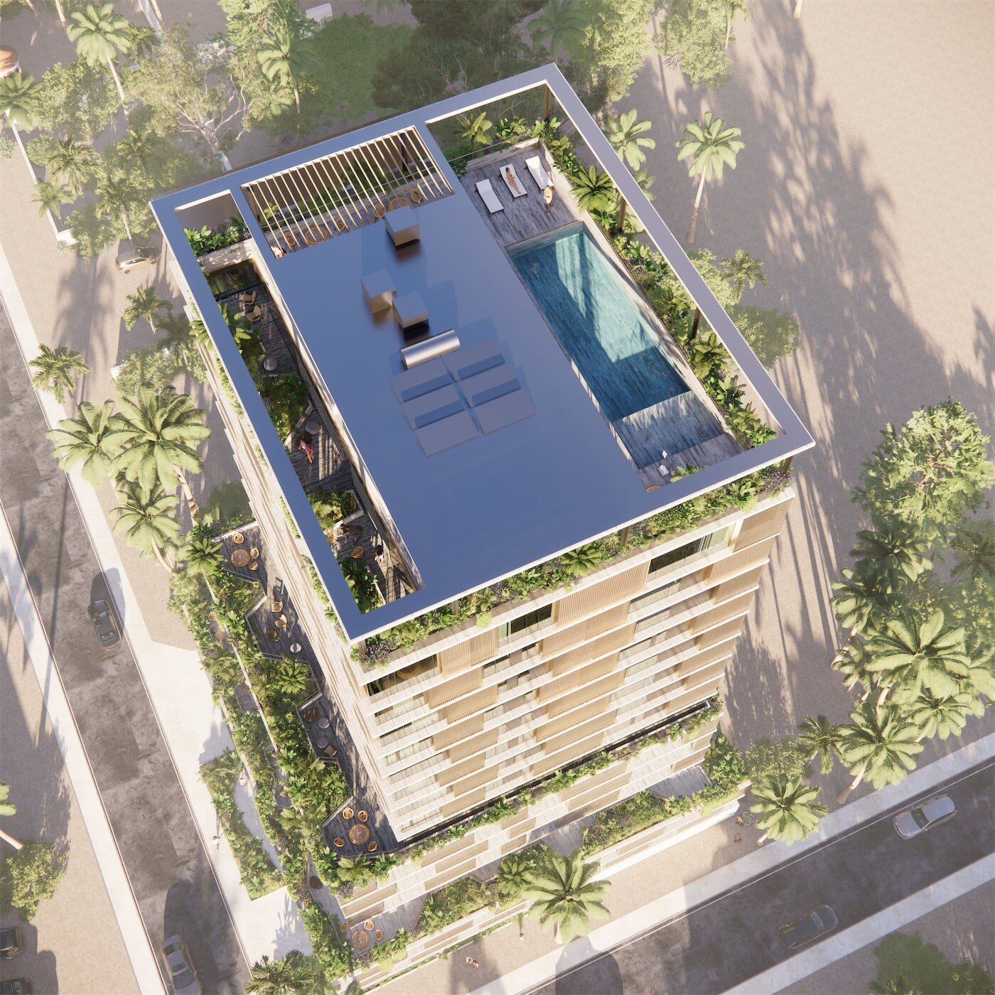 SQUARE72 contará con un área social cuidadosamente diseñada, ubicada en los dos últimos niveles del edificio, haciendo de esta un lugar de descanso al aire libre, para disfrutar en el día y en la noche. La vista a la ciudad y el mar, harán de la misma un lugar único para la relajación de todos.
